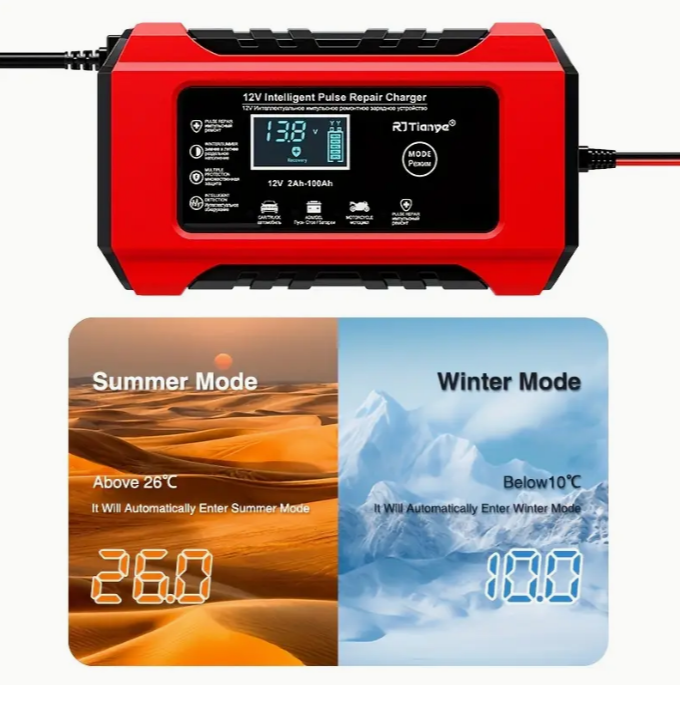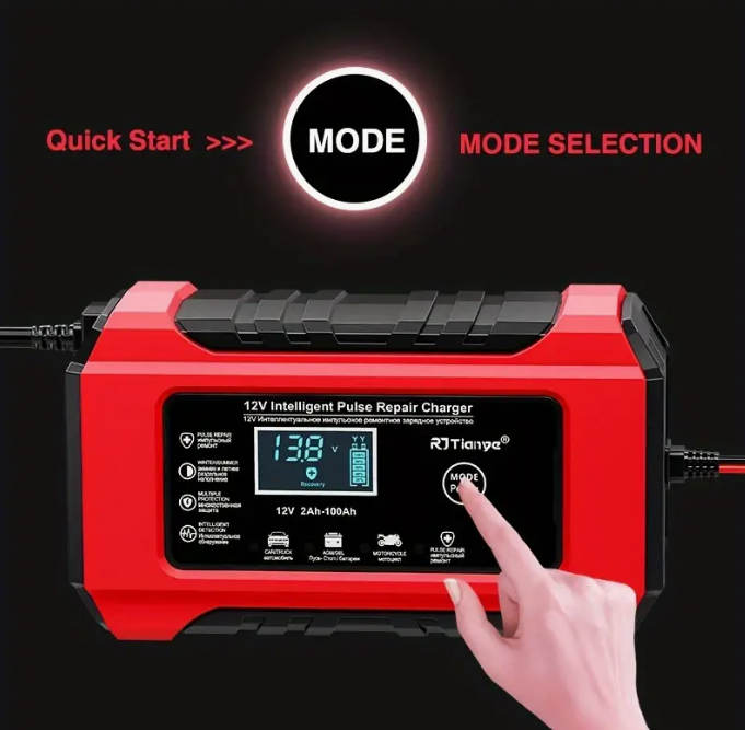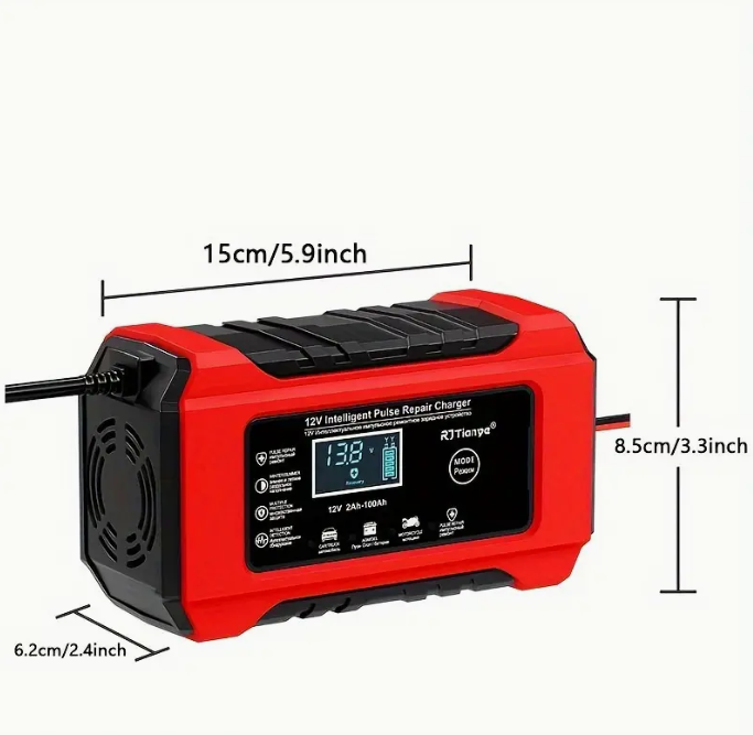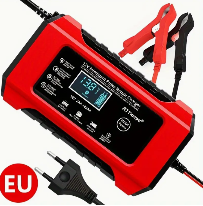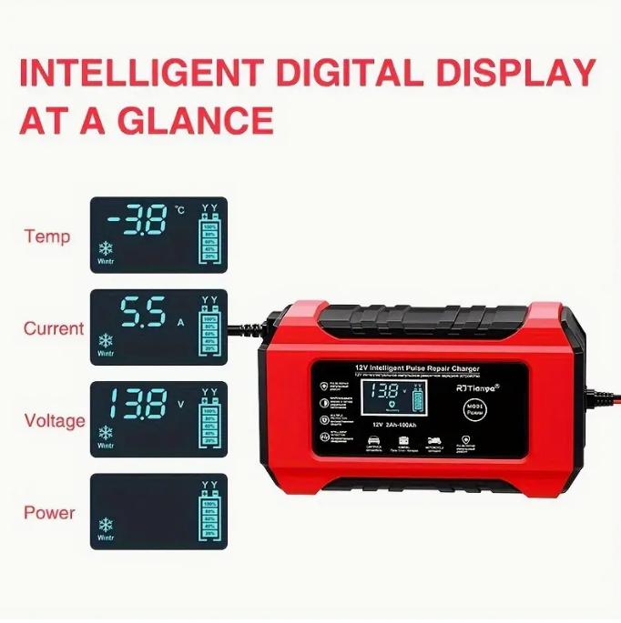 Caricabatterie auto multifunzionale da 12V, compatibile con batterie al piombo-acido, AGM, GEL e SLA. Con un design compatto ma potente, questo dispositivo offre una ricarica automatica intelligente e sicura, ideale per veicoli come auto, camion, motocicli, tosaerba e barche. Lo schermo LCD retroilluminato visualizza lo stato della batteria, e un sensore termico regola la carica in base alla temperatura ambiente. Grazie alla modalità di ripristino avanzata, è possibile recuperare batterie vecchie o inattive, prolungandone la durata. Il caricabatterie è dotato di protezioni multiple contro sovraccarichi, sovratensioni e cortocircuiti, rendendolo sicuro e affidabile.
