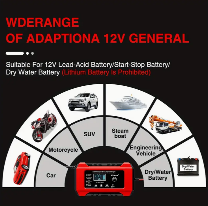 Uso consigliato: Auto, moto, camion, barche, tosaerba, e veicoli a batteria al piombo