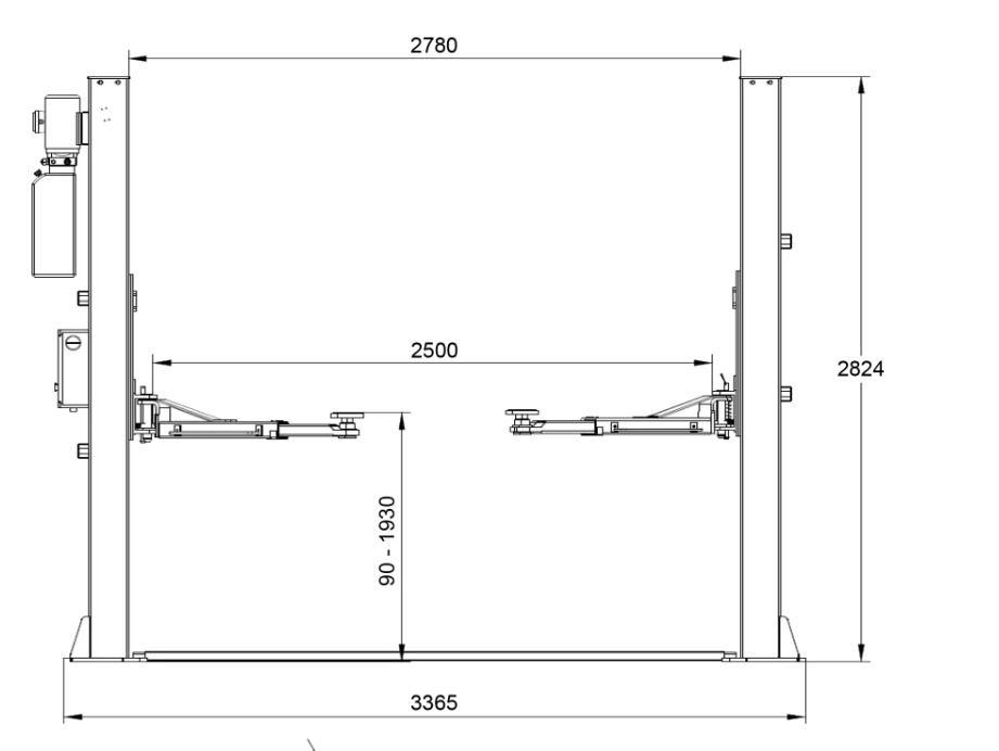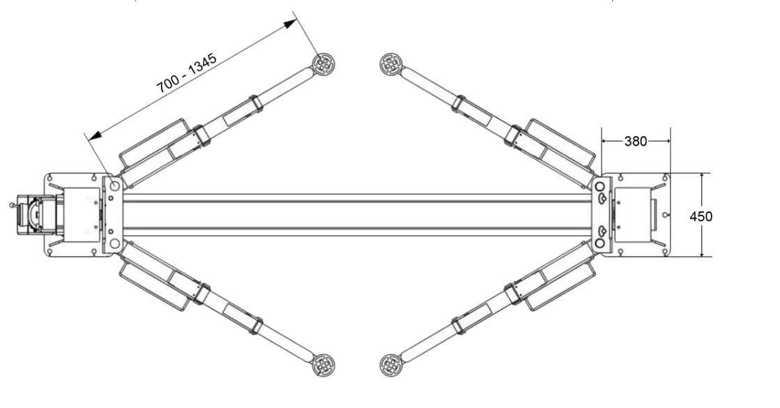 Questo sollevatore è dotato di bracci simmetrici, lunghezza 700-1345 mm.