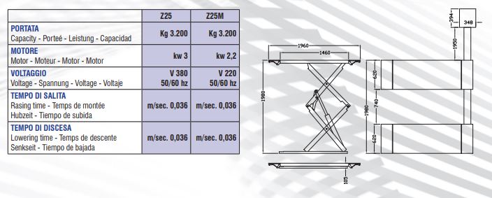 Ponte sollevatore doppia forbice MADE IN ITALY portata 3500 kg alzata 195 cm alimentazione 220V o 380V